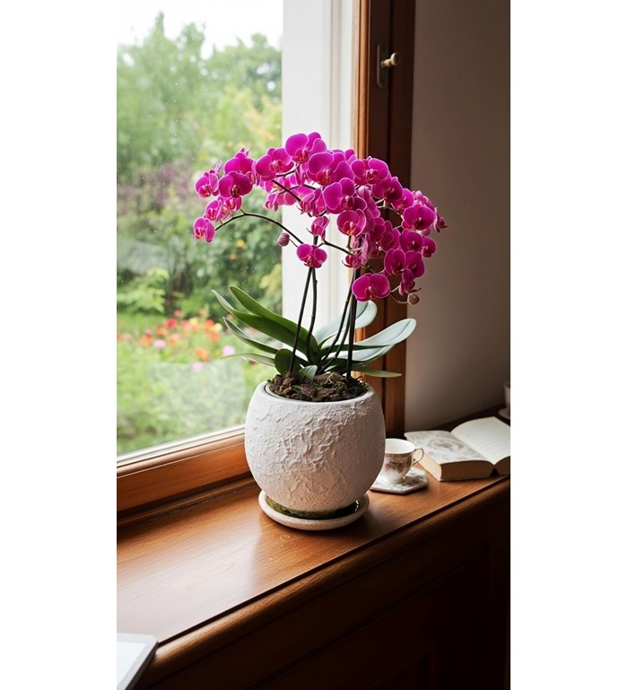 Özel saksısında mor renkli phalaenopsis orkide.