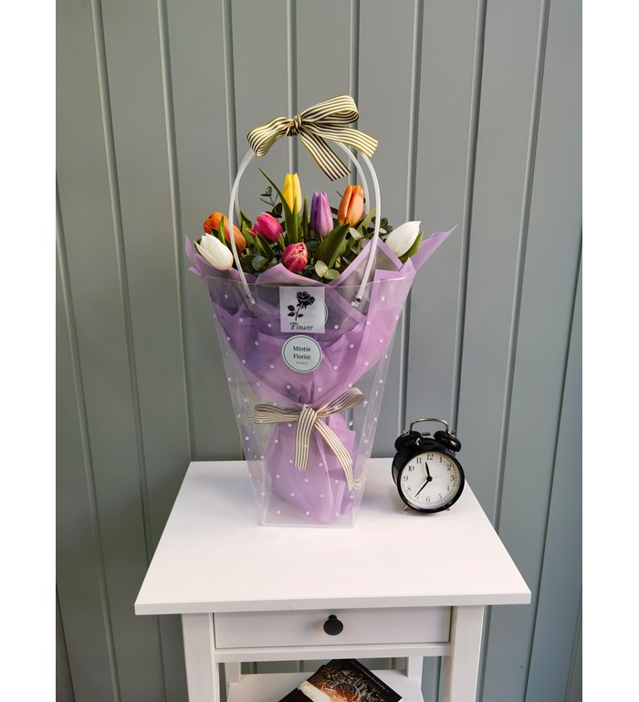 Özel çiçek çantası içerisinde renkli laleler buketi.