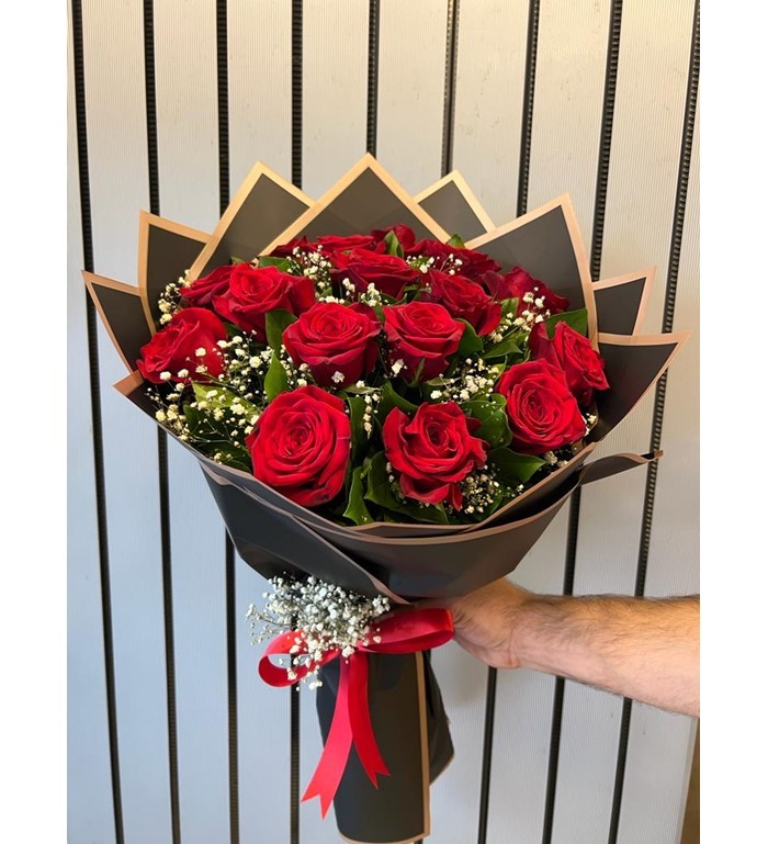 15 adet kırmızı gül ile hazırlanmış gül buketi.