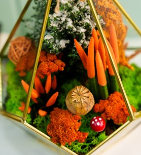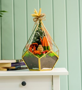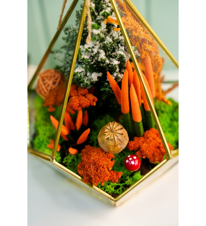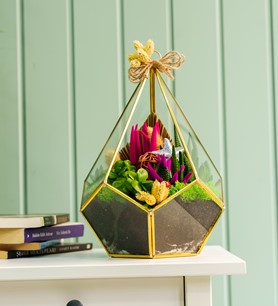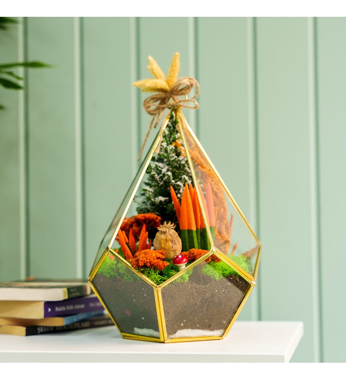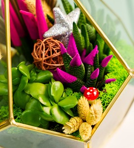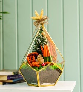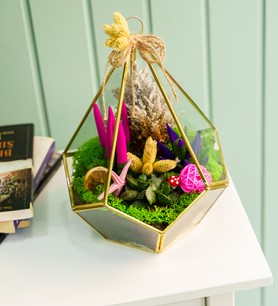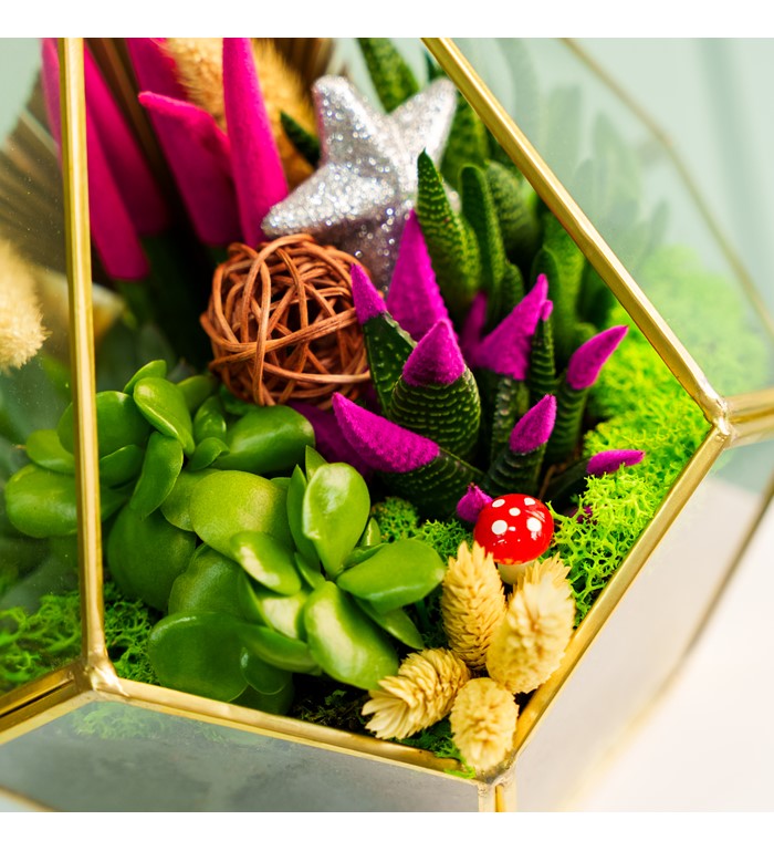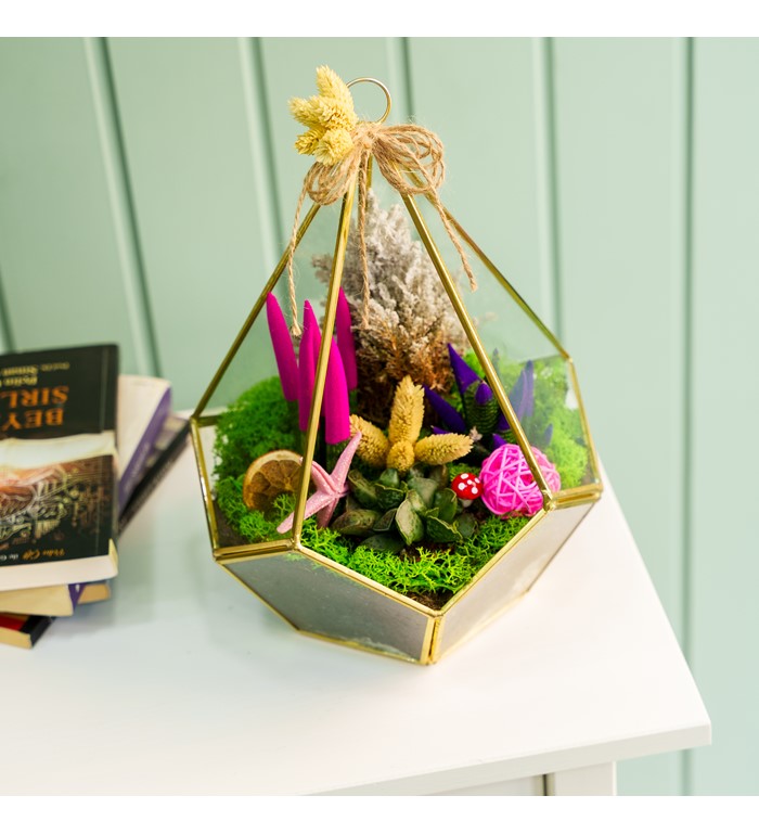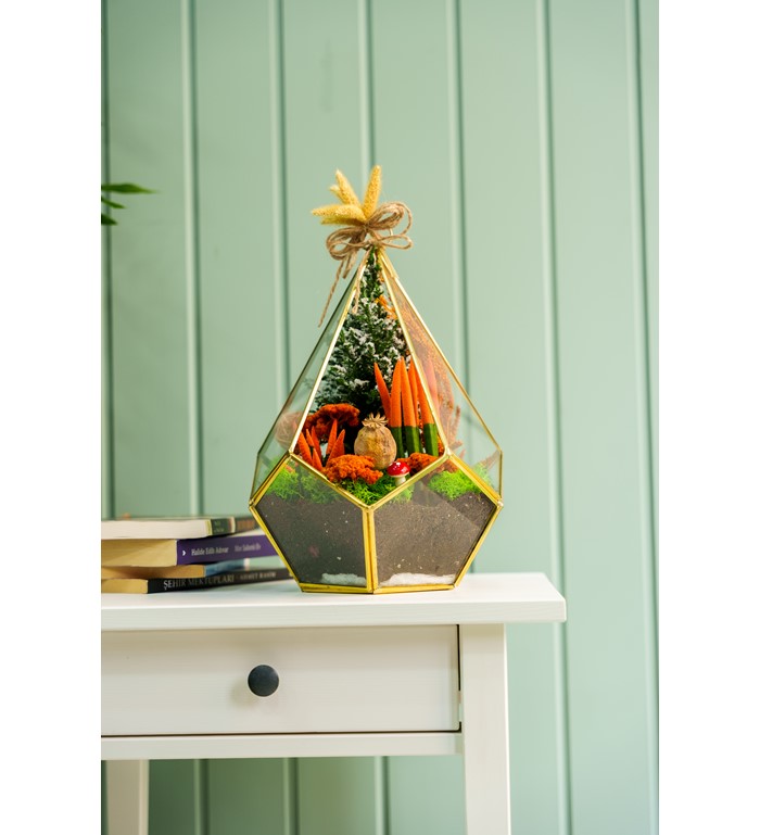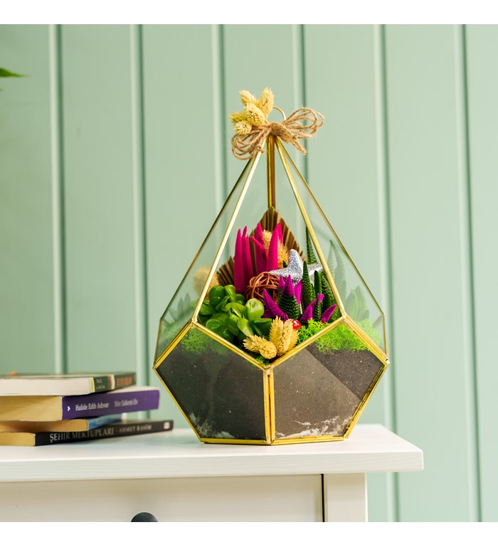 Özel Piramit cam içerisinde Bambu Palmiyesi, meksika kaktüsler ve aksesuarlar ile hazırlanmış özel teraryum.