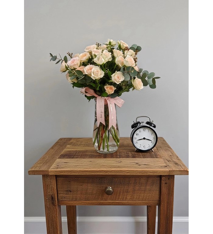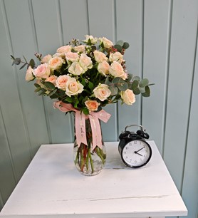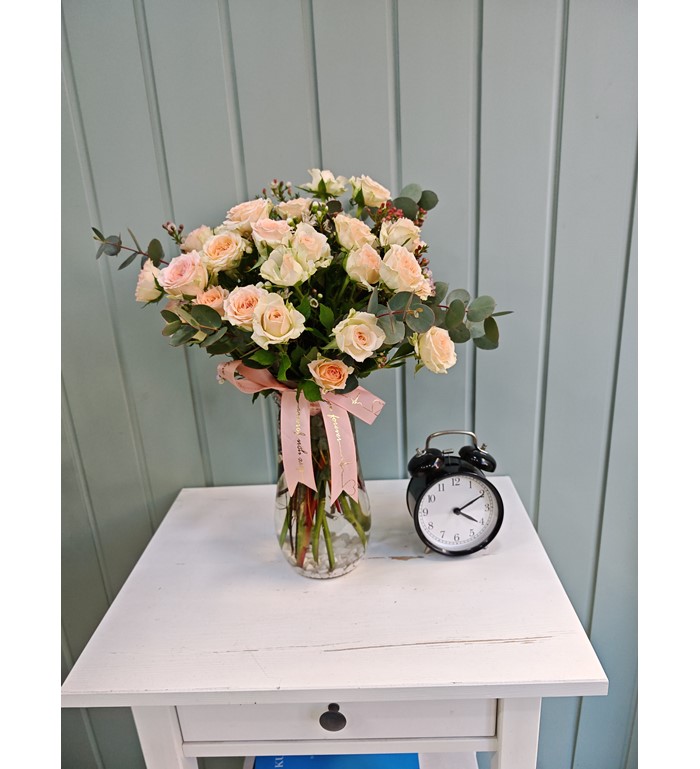 Cam vazo içerisinde somon ya da açık pembe çardak gülleri ve okaliptüs yeşillikleri ile hazırlanmış özel ürün