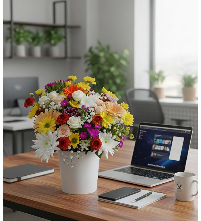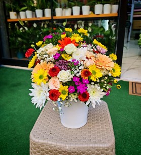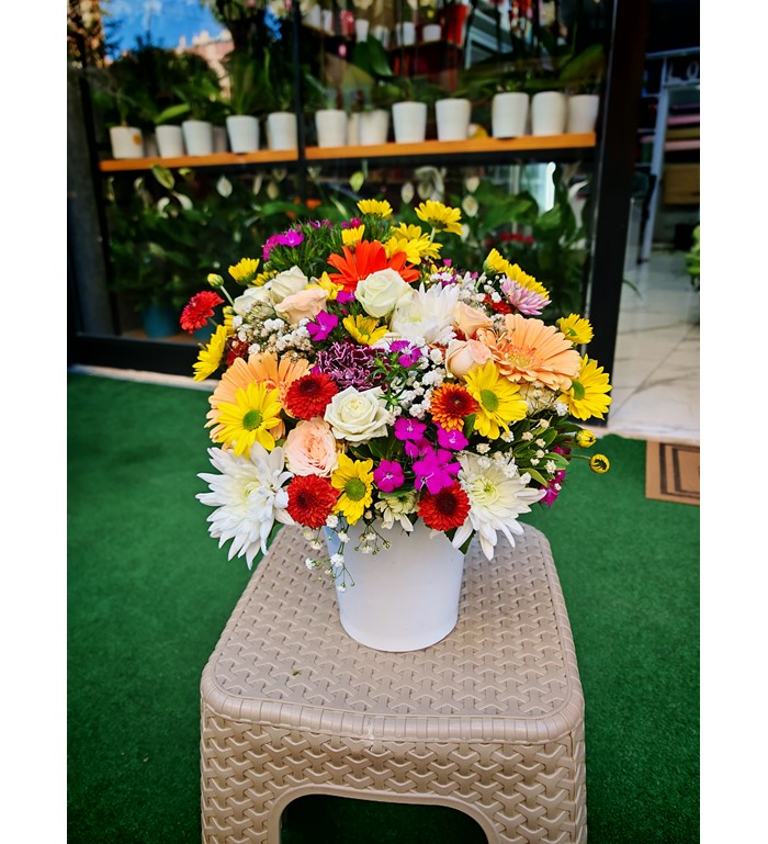 Beyaz seramik saaksı içerisinde rengarenk mevsim çiçekleri ile hazırlanmış çiçek aranjmanı.