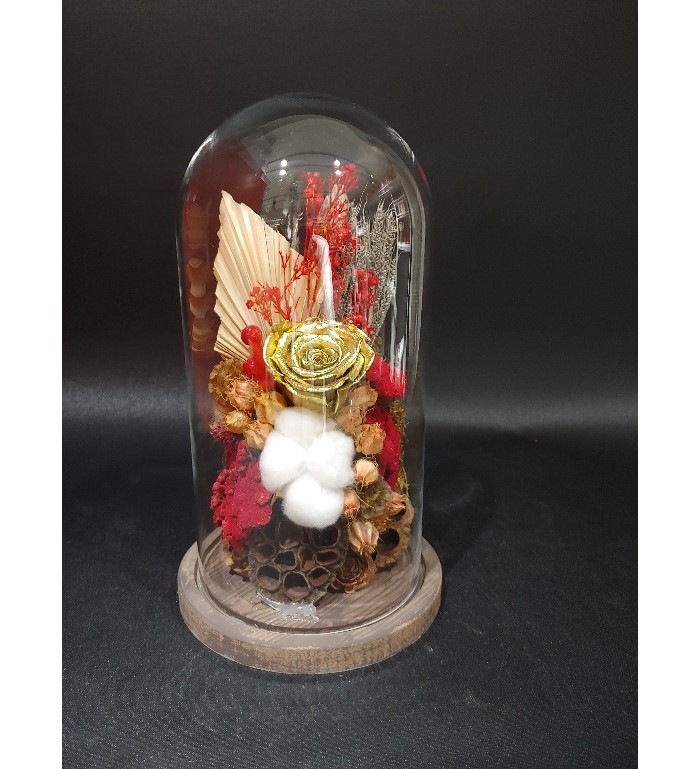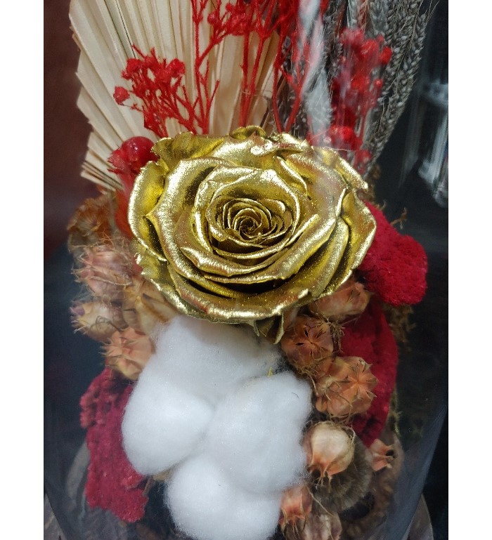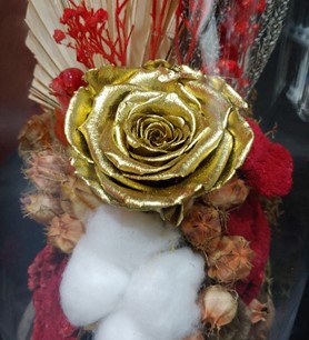 Özel cam içerisinde kurutulmuş çiçekler ve Gold Renkli Solmayan Gül ile hazırlanmış özel tasarım.