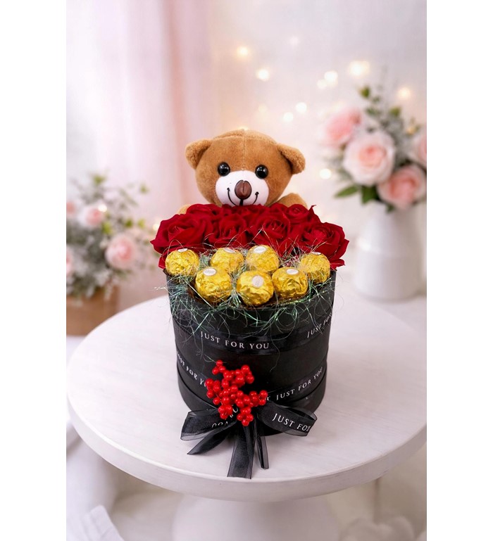 Siyah silindir kutu içerisinde kırmızı yapay güller, peluş ayıcık ve ferrero rocher çikolatalarla hazırlanmış kişiye özel hediye kutusu.