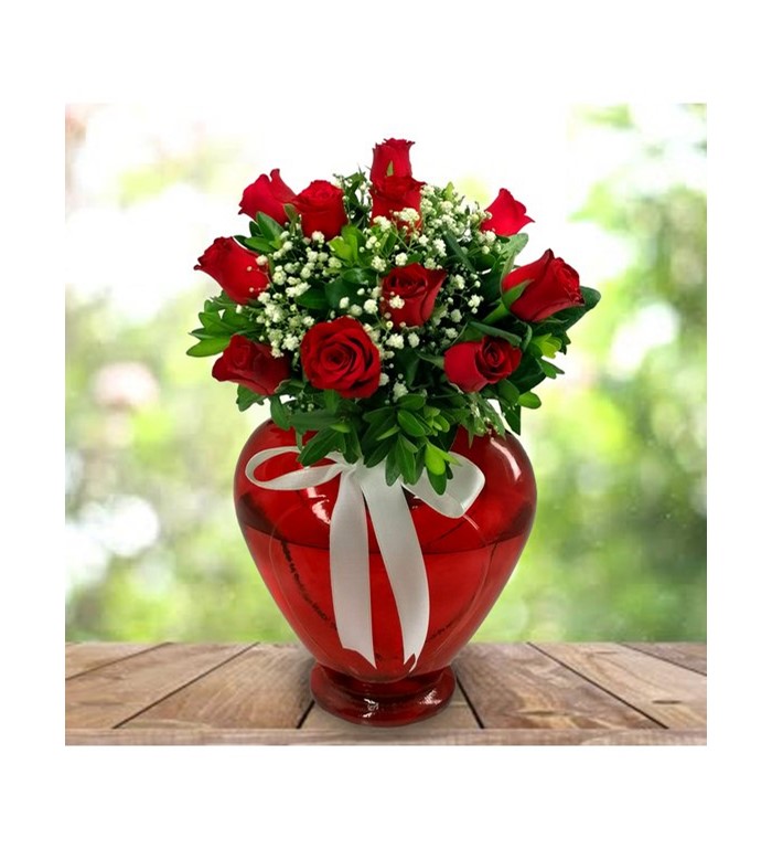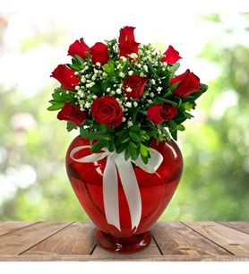Kırmızı kalp vazo içerisinde kırmızı güller, yeşillik ve cipsofilya ile hazırlanmış özel ürün.